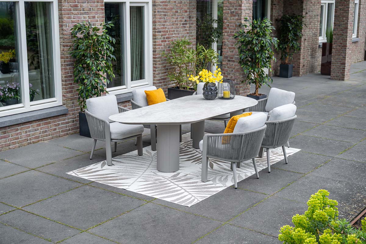 Tischgruppe Rope, Alu Taupe, Kissen beige, Sessel B. 65 cm, Tisch oval 230 x 115 cm .