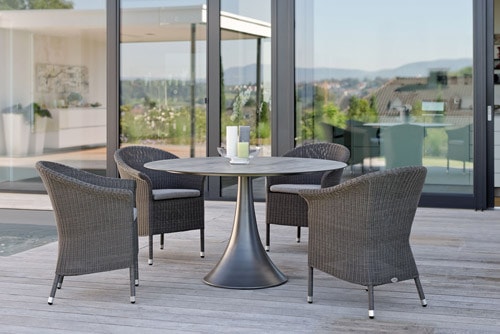 Geflechtgruppe hellgrau Sessel Kufengestell: Edelstahl Rope grau. Tisch 120cm rund HPL Platte Gestell Edelstahl anthrazit.