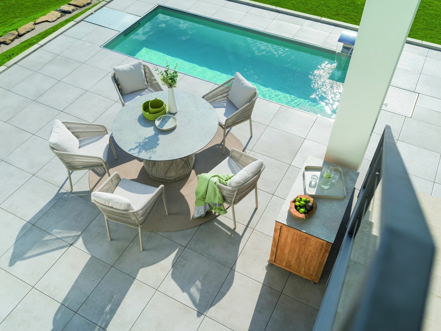 Sitzgruppe Alu anthrazit, Sessel Rope taupe, Kissen sand. Tisch 148cm rund Teak Vironwood.