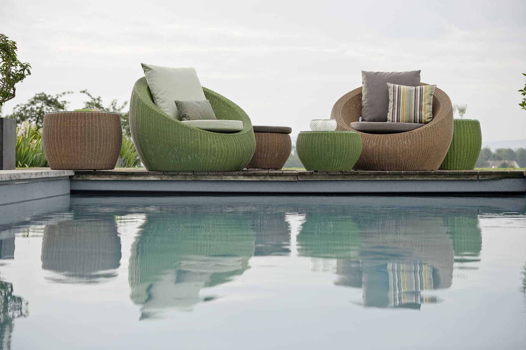 Sonnen Sessel Geflecht grün mit Kissen hellgrün 1195,- Tisch-Hocker 54 x 32 cm mit Glasplatte 359,- verschiedene Farben lieferbar