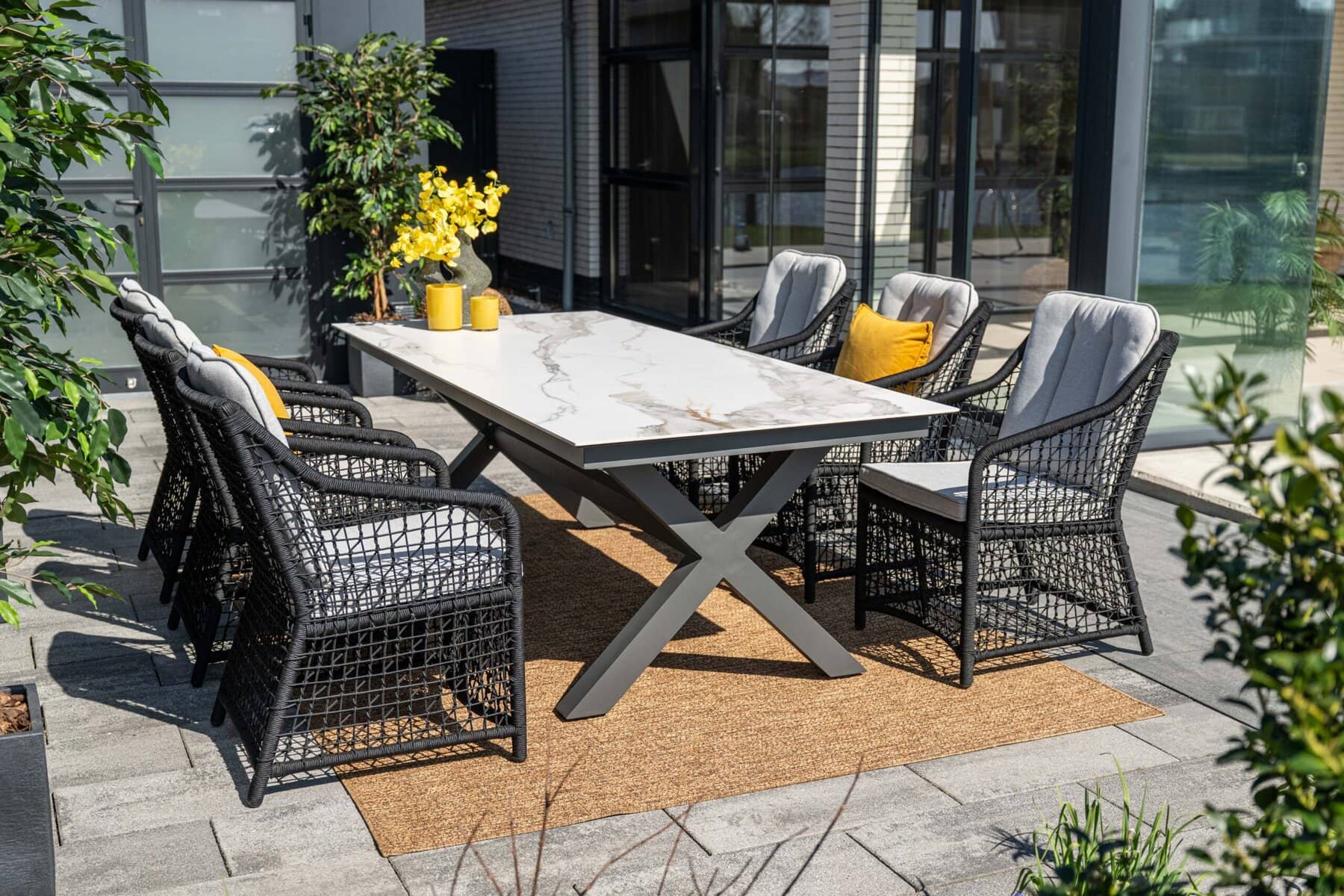 Sitzgruppe Alu anthrazit, Sessel Rope natur, Kissen sand. Tisch 205x100cm und 240x100cm lieferbar.