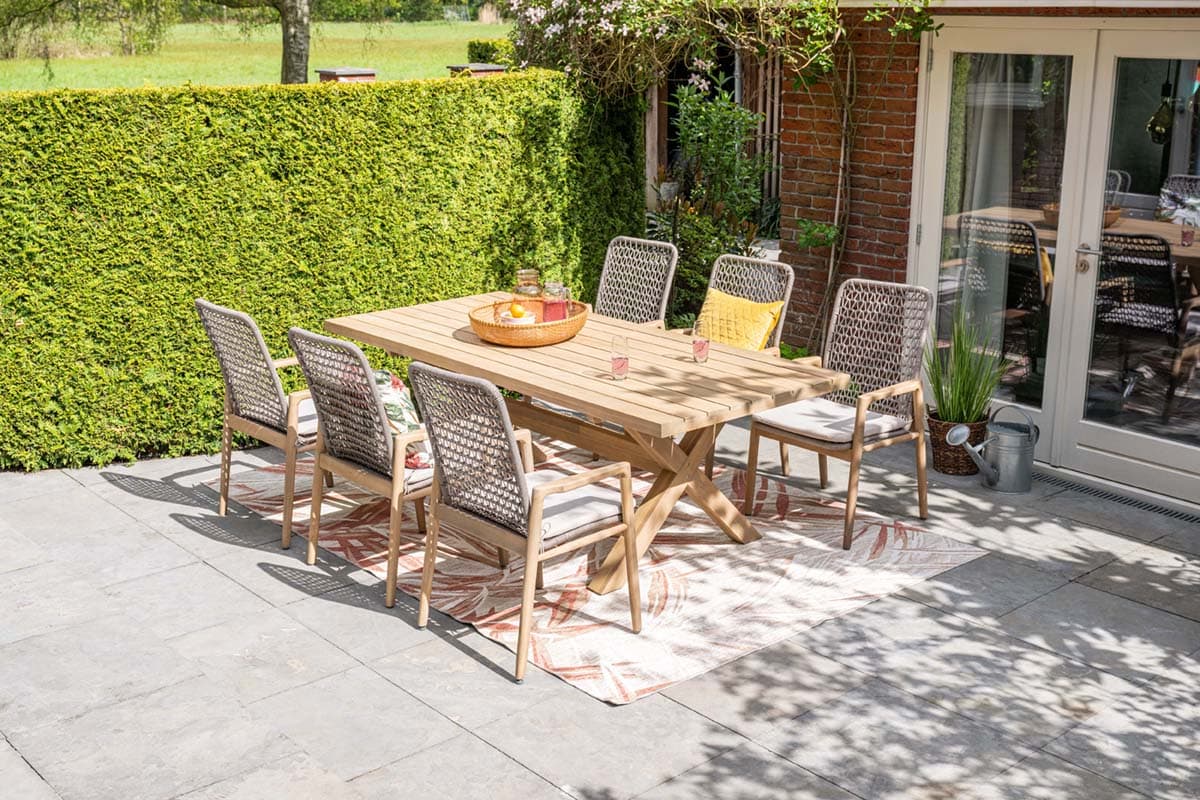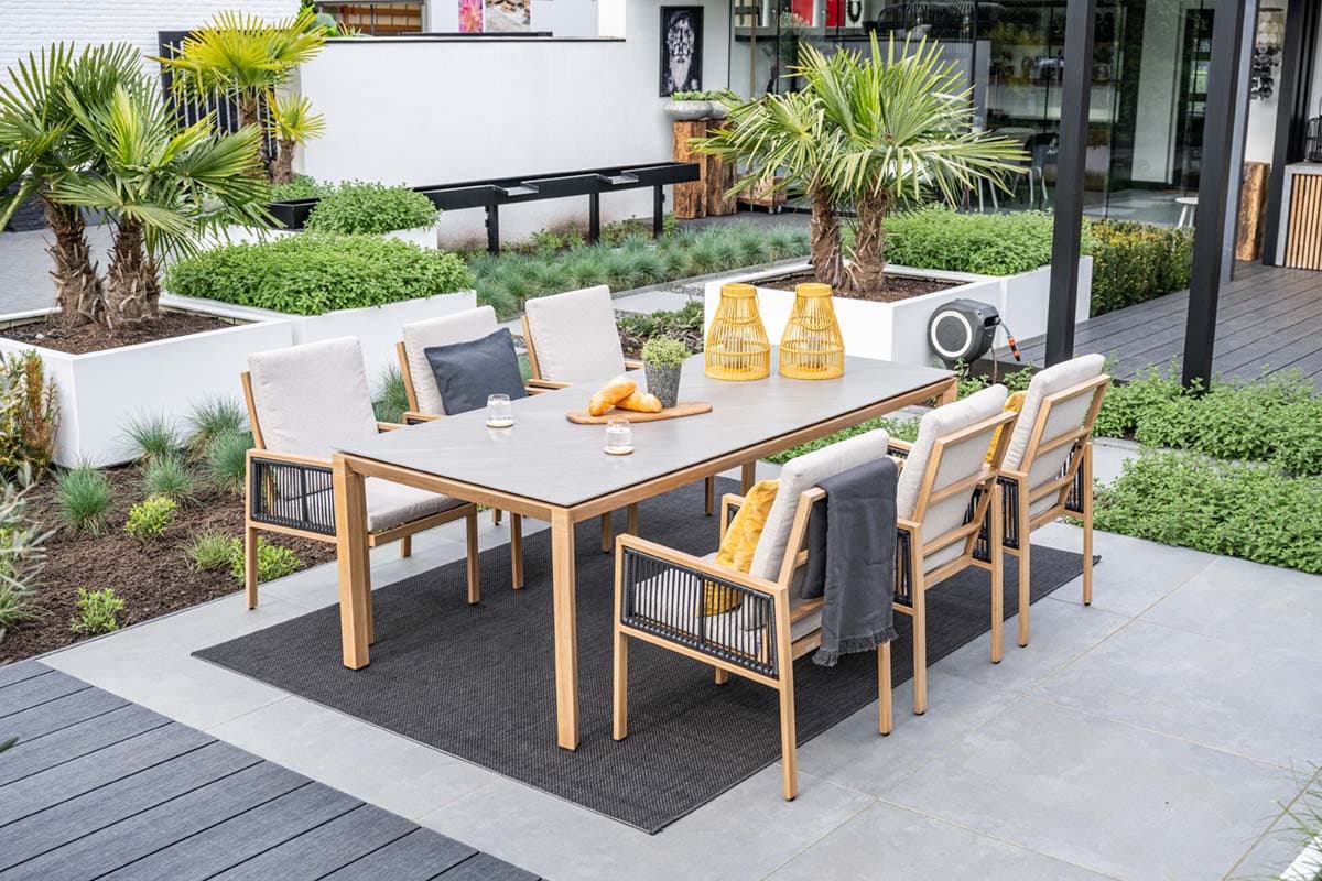 Sitzgruppe Acia Teak, Rope taupe, Kissen natur. Tisch ocal 220x115cm.