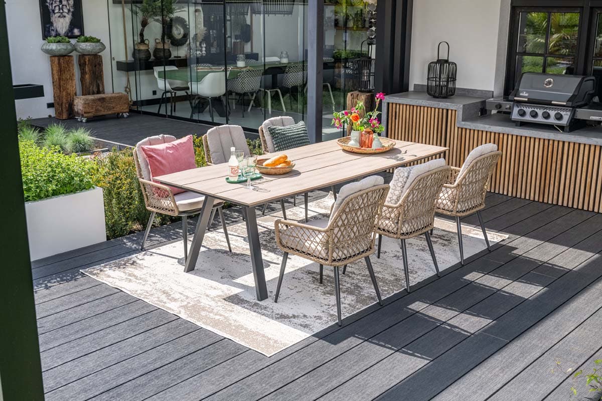 Sitzgruppe Alu anthrazit, Sessel Rope taupe, Kissen sand. Tisch 230x115cm.