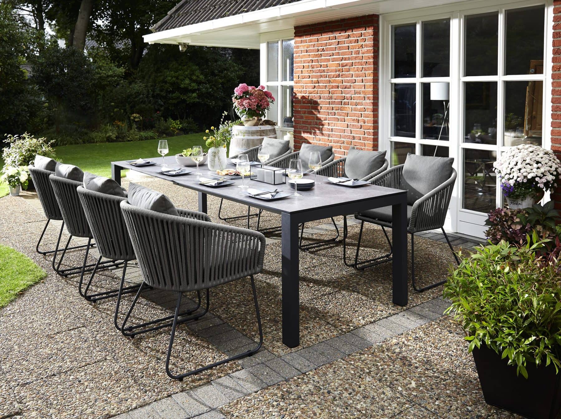 Tischgruppe Alu anthrazit, Stapel Sessel Rope stone. Tisch 220 x 100 cm.