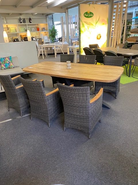 Geflechtsgruppe, Sessel hell-braun mit Teak Armlehnen, Sitzkissen grau, Old Teak Tisch 220x100cm.
