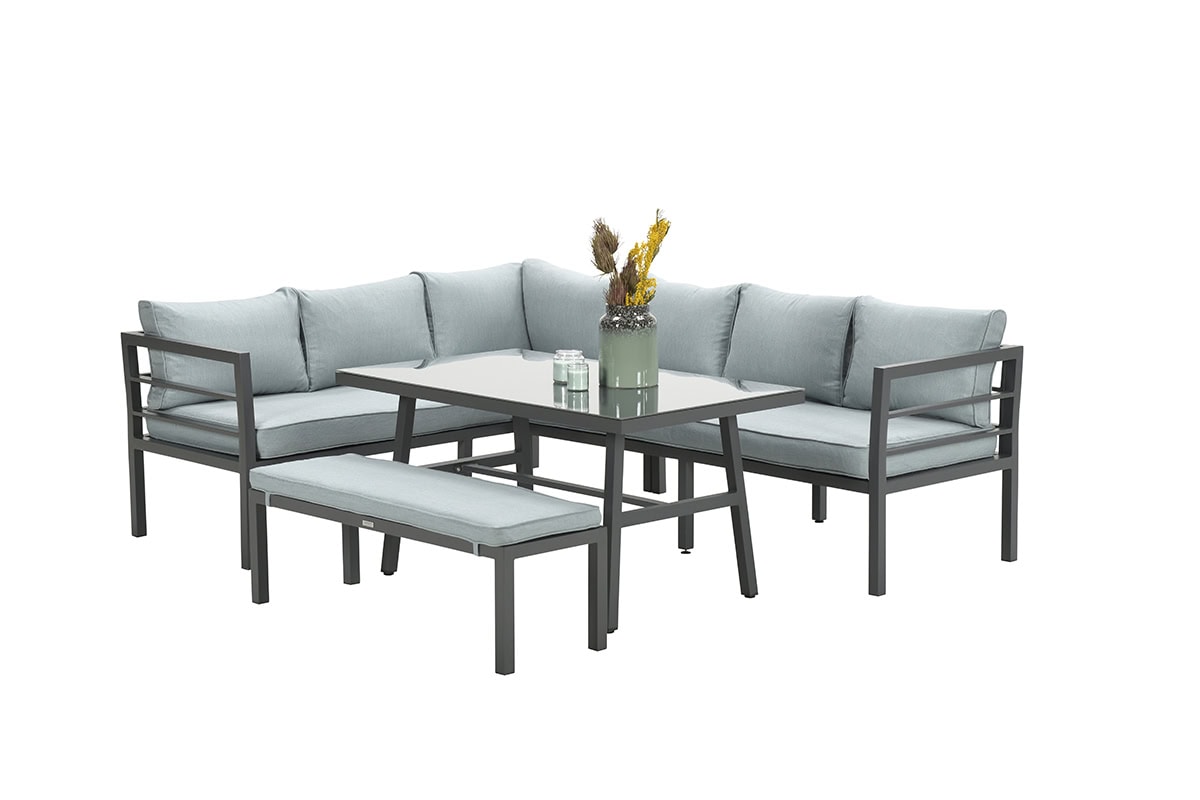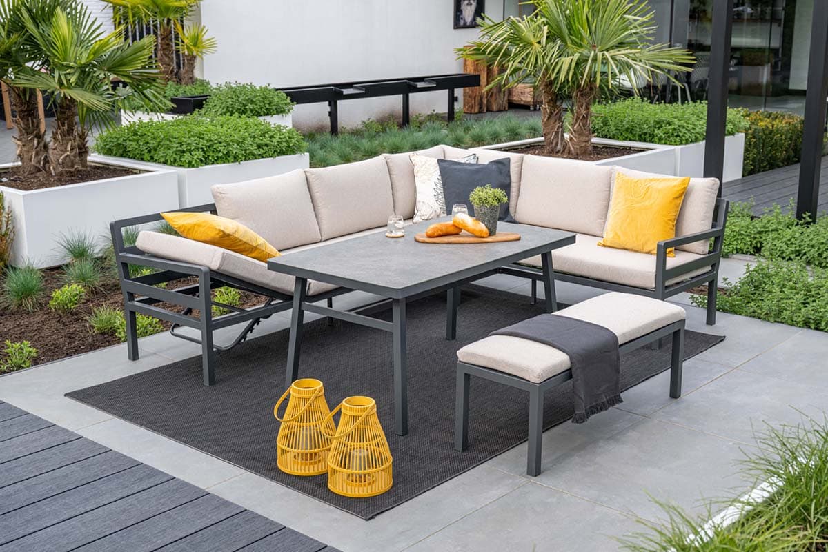 Esshöhe  Sitzgruppe  Alu anthrazit mit Kissen beige, Eckbank 232 x 232 cm, Tisch 115 x 115 cm H. 68 cm, Sitzbank 115 x 40 cm.