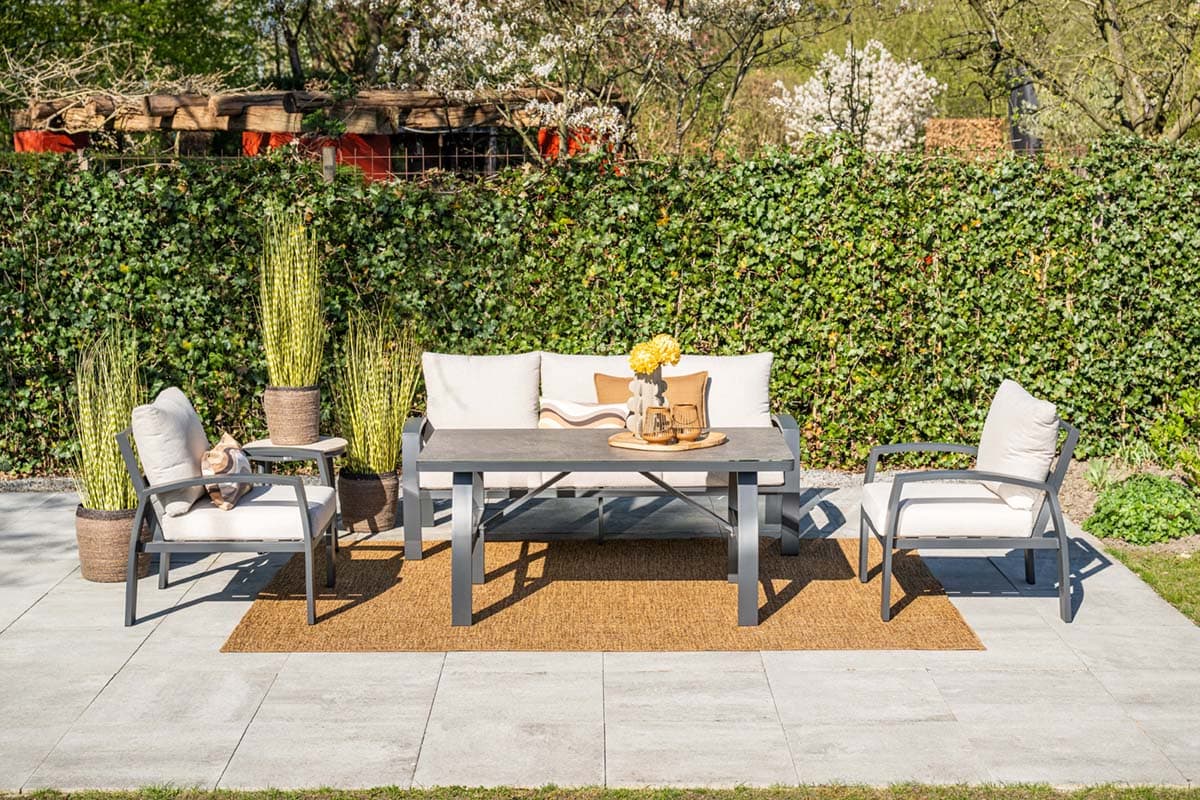Sitzgruppe Alu anthrazit, Kissen Beige Sofa 184 x 80 cm, Sessel B. 72 cm, Tisch 150 x 80 cm, H. 68 cm.