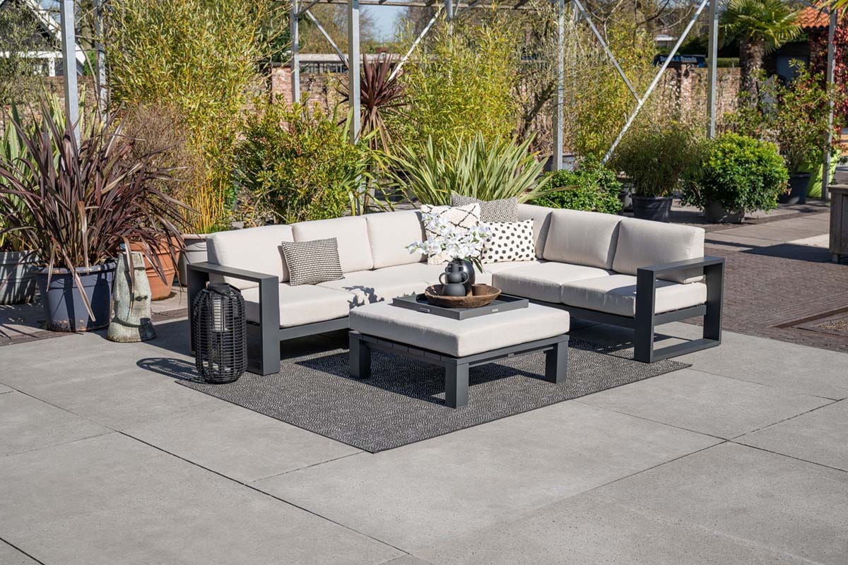 Ecklounge Alu anthrazit , Kissen beige  280 x 280 cm, Tisch 86 x 86 cm H. 26 cm, Tisch 64 64 cm H. 21 cm.