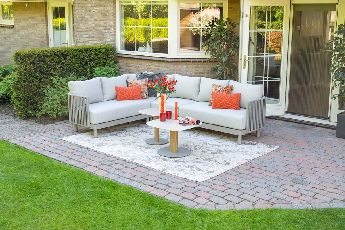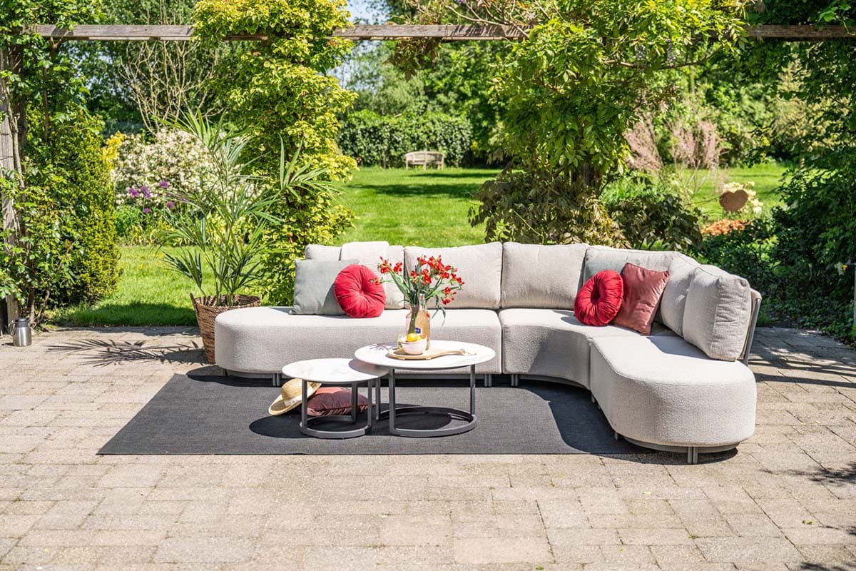 Lounge Alu beige, Rope sand, Bezug beige  270 x 270cm, mit Tische Ceramic 75 cm rund H. 36 cm, Tisch 50 cm rund H. 43 cm.