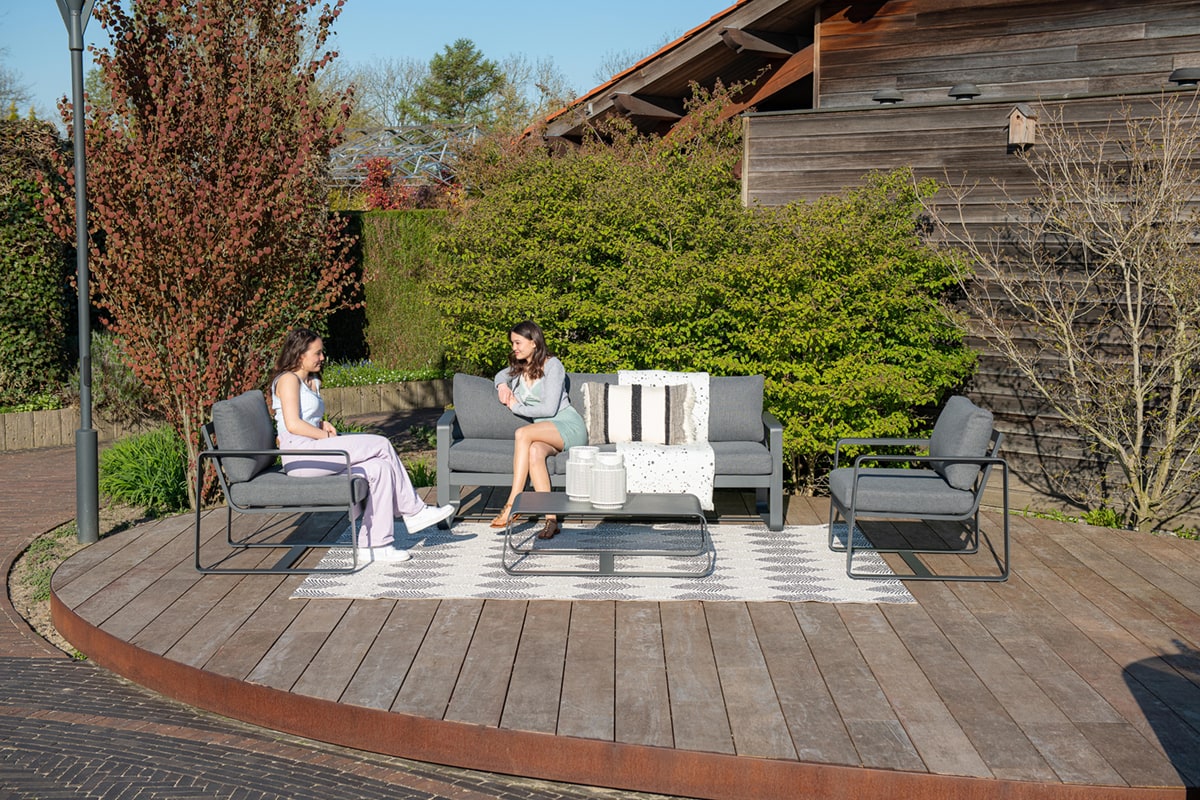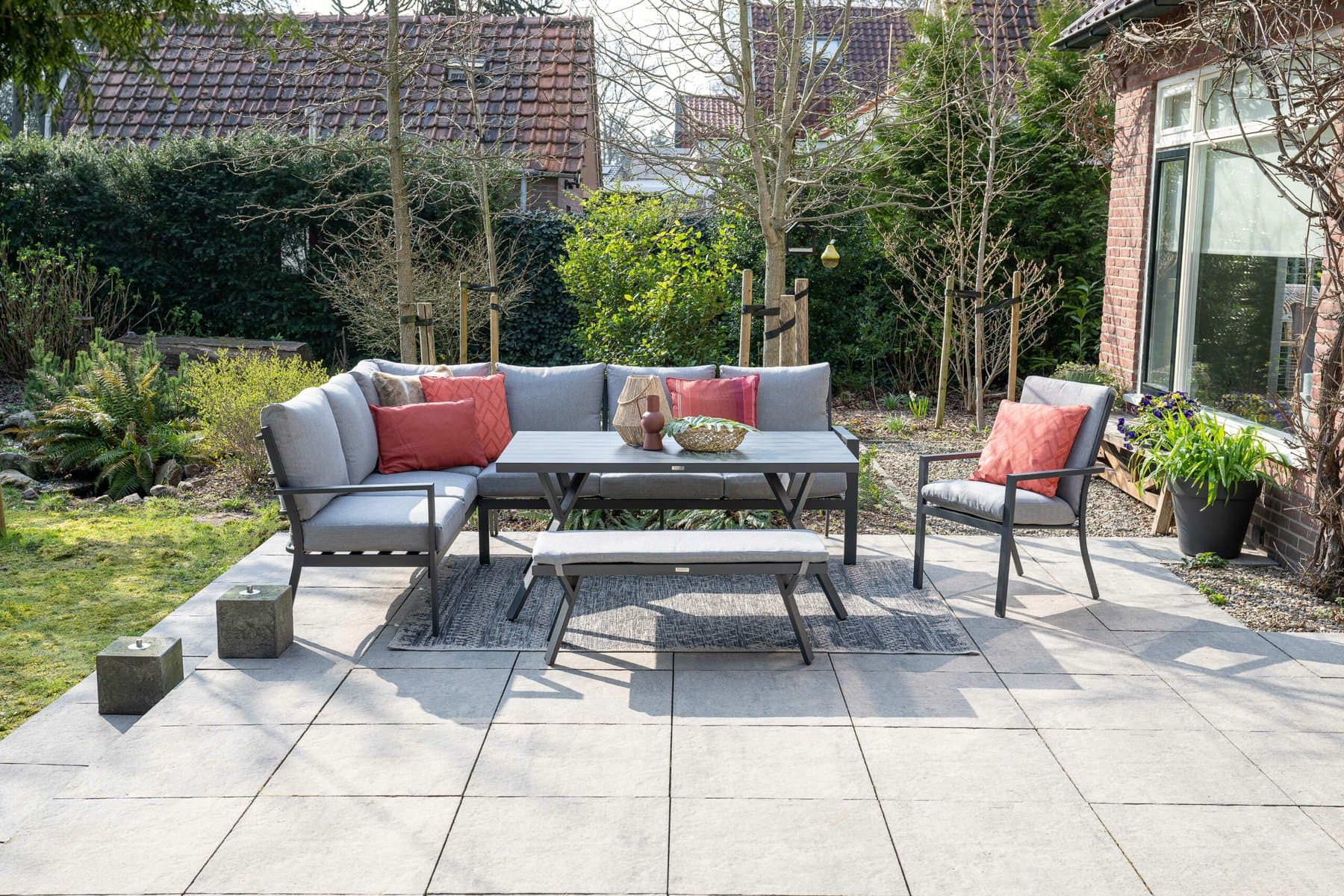 Bankgruppe Alu anthrazit, Rope dkl. grau, Sofa 197 x 73 cm, Sessel B. 71 cm, Tisch HÖHEN VERSTELLBAR H. 52 bis 75 cm. Bank 140 x 40 cm.