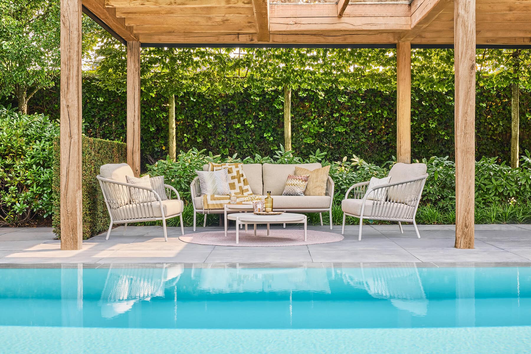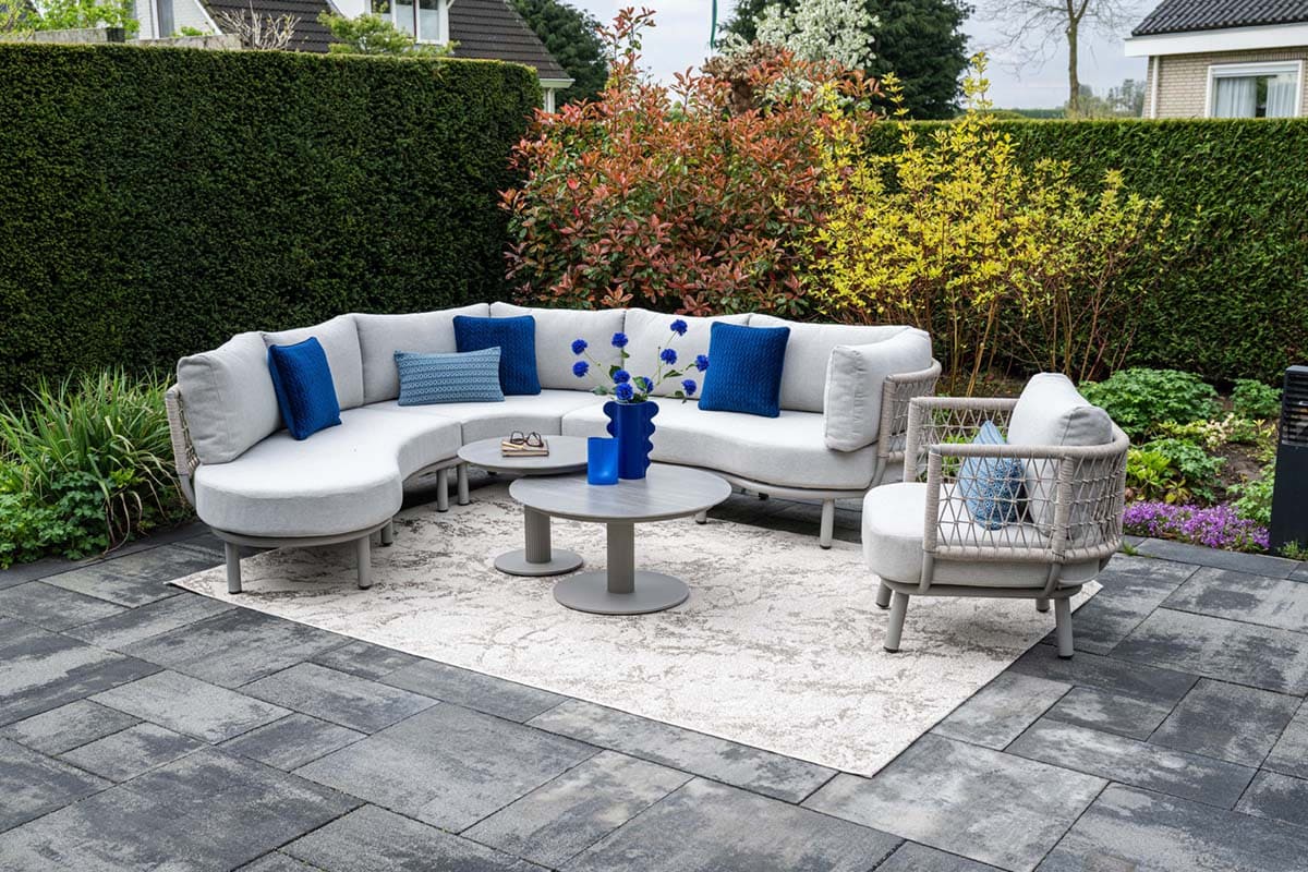 Alu Lounge Taube, Rope Beige  271 x 250 cm, Sessel B. 75 cm, Tische 80cm u. 60 cm rund.