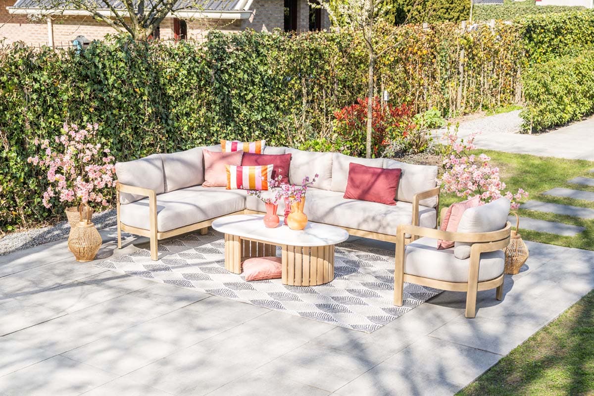 Acacia Lounge, Kissen Beige  270 x 196 cm, auch Spiegelbildlich lieferbar. Tisch 130x70x40cm.