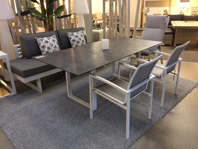 Rope Sitzgruppe Alu: Beige Sofa 201 x 78 cm, Sessel B. 76cm, Tisch 130 x 70 cm.