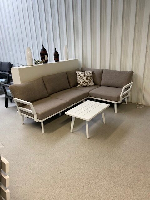 Lounge Alu weiß  253 x 172  cm Bezug: braun, auch in Bezug: grau lieferbar, auch Spiegelbildlich, alle Teile auch  einzeln lieferbar.  Tisch 75x50cm.
