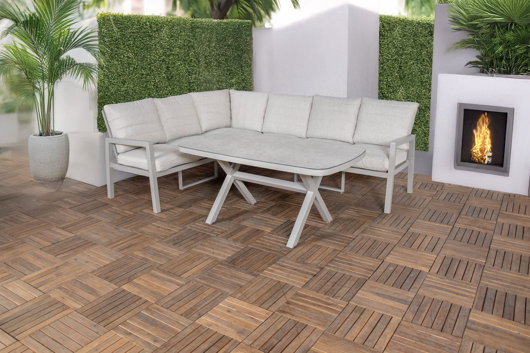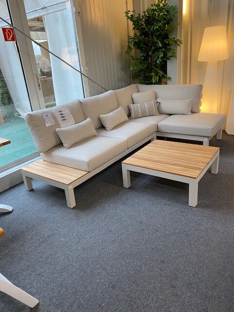 Ess Lounge Alu weiß, mit Teakarmlehen Ecksofa  234x234cm,  Tisch 115x115x70cm. Ausverkauft