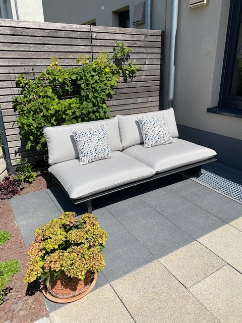 Lounge  W e t t e r f e s t  , Bezug: grau  Alu Füße anthrazit, Stoff Sunbrella mit Füllung aus schnell trocknendem Schaumstoff. Das Wasser läuft durch den Spezialschaum ab. Ausverkauft