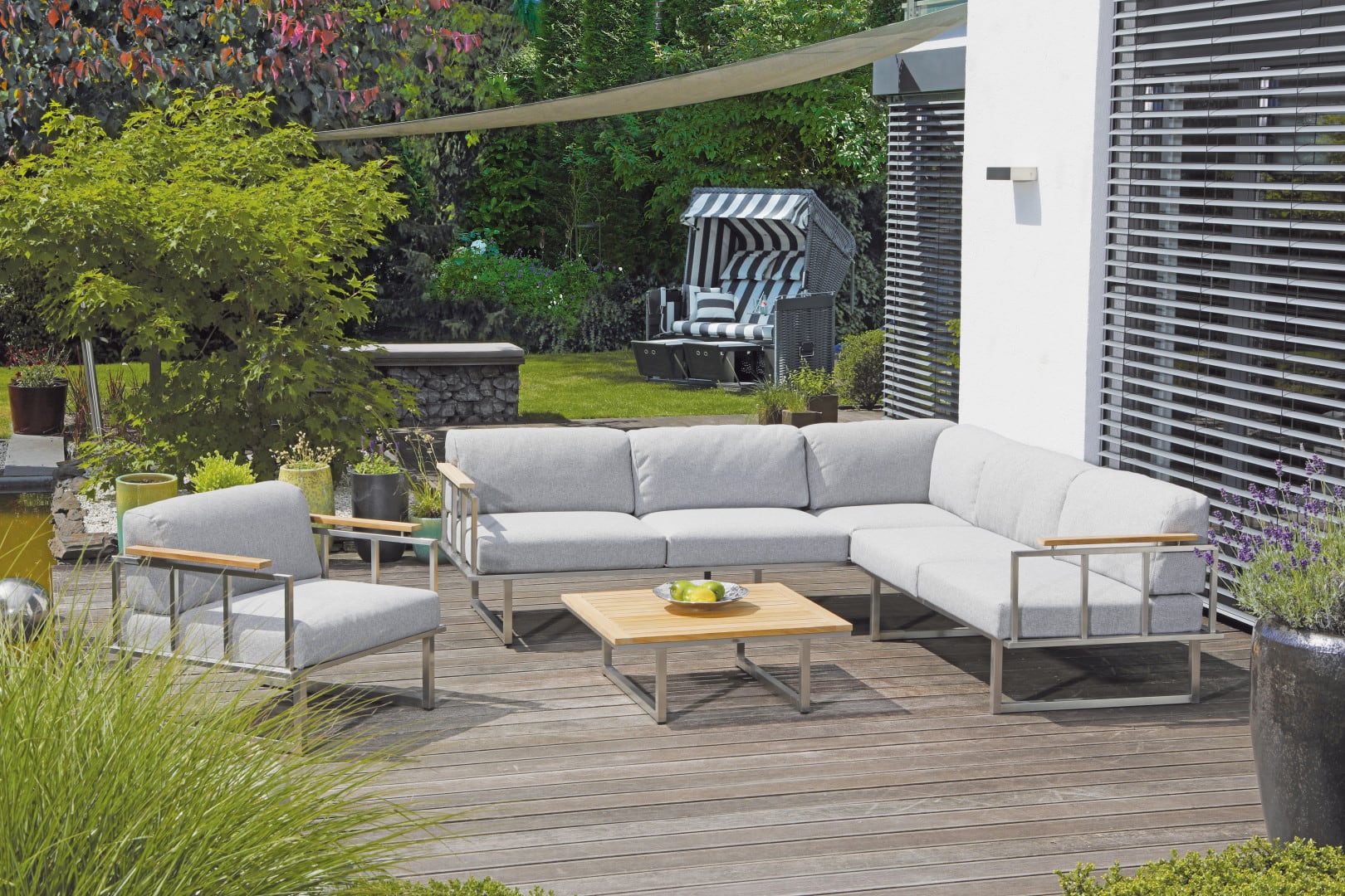 Lounge Edelstahl mit Teak, Sofaecke   235 x 235 cm  Tiefe 82cm Rückenhöhe mit Kissen  75 cm, Höhe Armlehne 60cm  Sitzhöhe 42 cm,  Tisch 80 x 80 cm,  Sessel